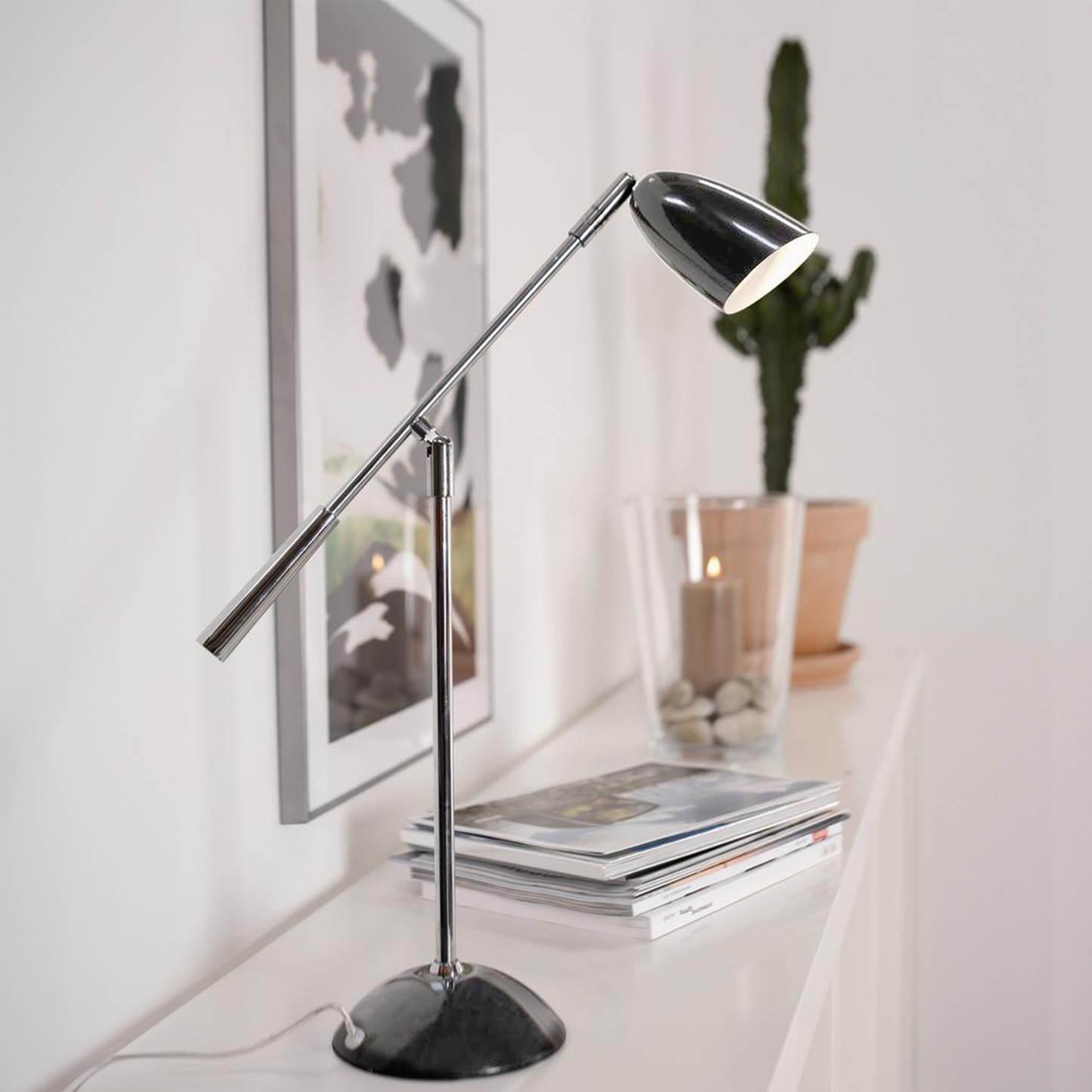 The Einstein Chrome Table Lamp offers a sleek and versatile lighting solution suitable for various settings, whether placed on bedside tables, consoles, or coffee tables. Primarily used as a desk light in offices and home offices, it's also favored by hobbyists and artists for its functionality and stylish design.